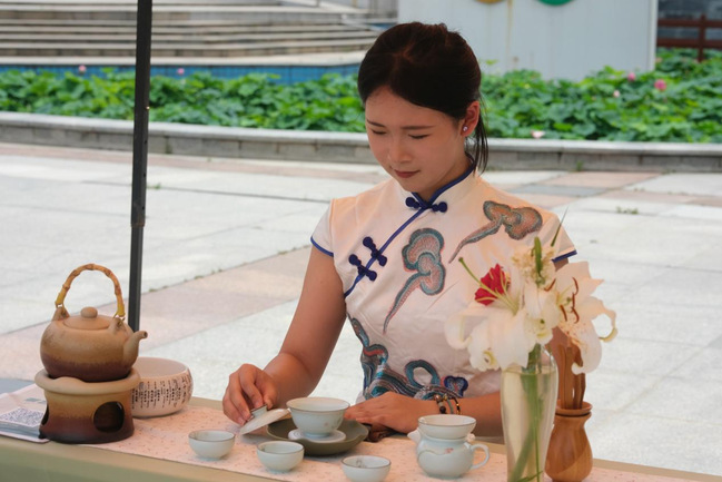 一位来自巴基斯坦的留学生对长嘴壶特别感兴趣,历经多次挑战,终于能将长嘴壶里的水注入盖碗中,他感慨道:“喝个茶还要耍一套工夫,太有意思了!中国茶文化博大精深,充满无限魅力。”