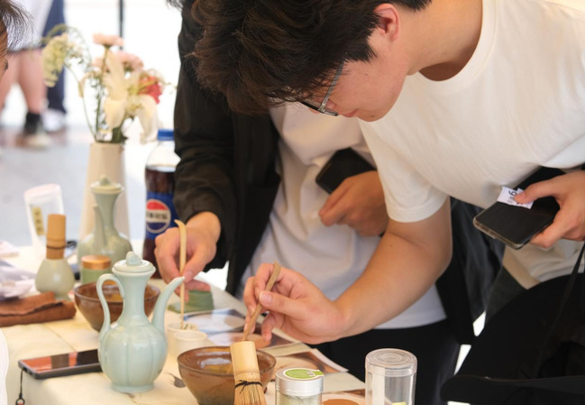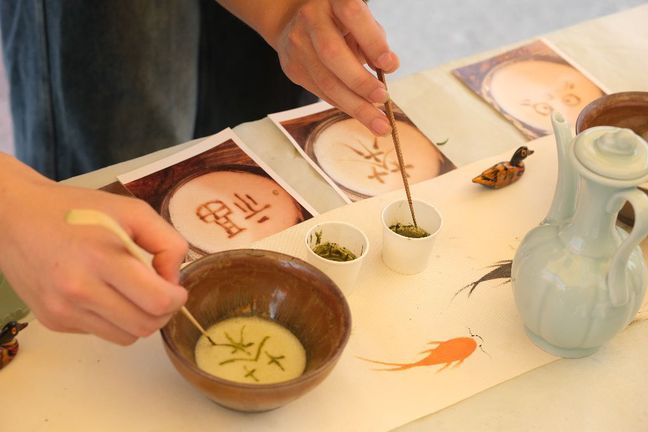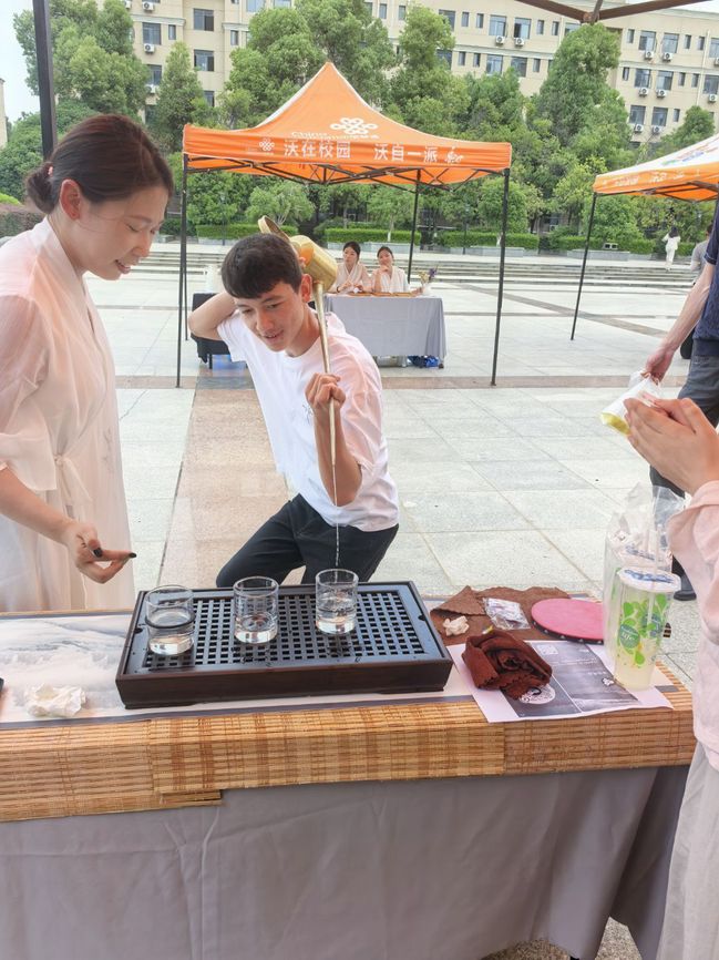 宋代点茶摊位宛如一条时光隧道,将师生们带回千年之前的宋朝。在这里,时光仿佛按下了慢放键,先将茶粉放入茶盏中,以水注点,手持茶筅击打茶汤,茶汤随之泛起细腻的乳白色沫饽,一碗点茶就做好了。在茶汤之上,还可以作画写字,称之为“茶百戏”。参加挑战者拿起茶针,在细腻的茶汤上轻轻描绘,沉浸式感受那份独特的雅致与宁静,仿佛与古人进行了一场跨越时空的心灵对话。