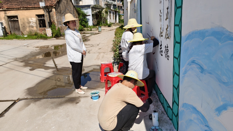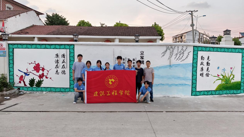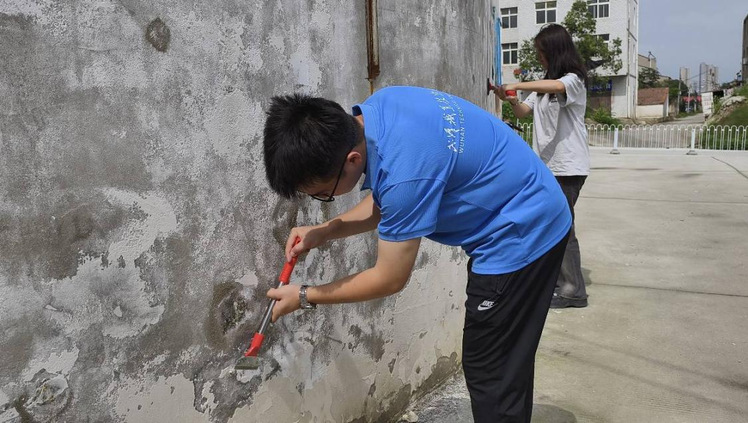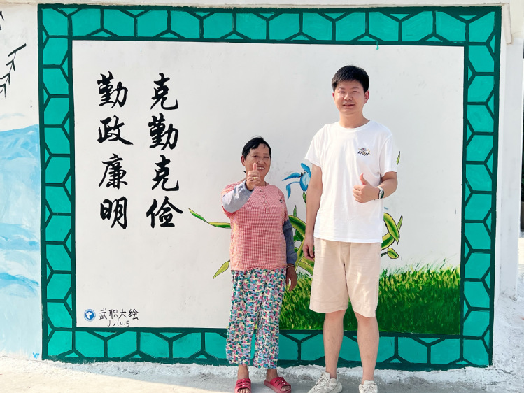 武汉职业技术大学建筑工程学院“砼心筑梦”服务队刘瑞、刘文婷、章聪、沈聪、向锐、胡世彬、魏雪怡、刘思雨、柳九嘉等9名队员,用7个昼夜把26.68平方米的斑驳老墙,变成村民口中“会走路的廉教课本。”