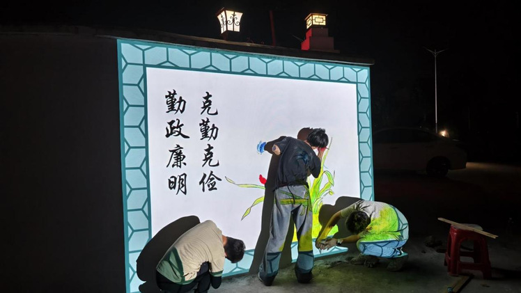 7月5日21时,武汉市新洲区阳逻街军民村,最后一盏探照灯熄灭,星光洒满夜空,一幅长11.6米、高2.3米的“清正廉洁”主题墙绘正式完工。