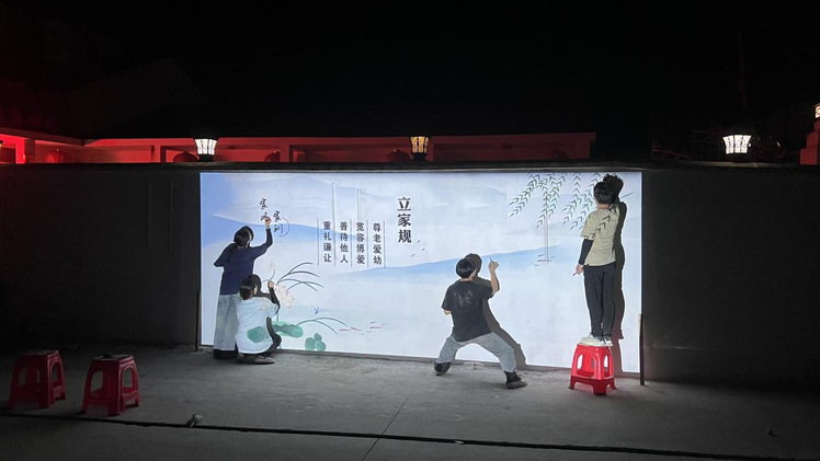 “走线!”向锐拿着铅笔沿着11.6米长的投影轨迹快速勾勒,荷花的轮廓很快在墙上显现。柳九嘉举着灯照明,激光水平仪发出幽绿的光 —— 他们将误差控制在±2厘米内,用建筑专业的严谨对待这幅艺术创作。