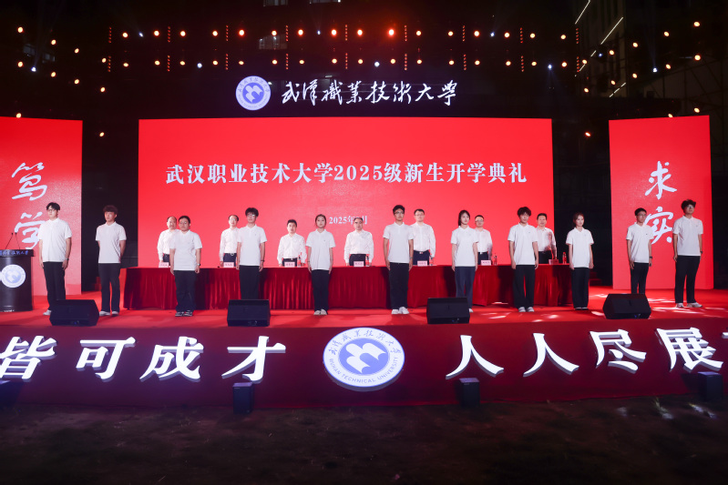 典礼现场,校领导为11名新生代表佩戴校徽,这一庄重仪式象征着他们正式成为“武职人”。在外语外贸学院新生李知远的领誓下,全体新生庄严宣誓,承诺恪守校训、勤学实干,立志成长为“厚于德、勤于学、精于技、敬于业、勇于创”的新时代大国工匠。
